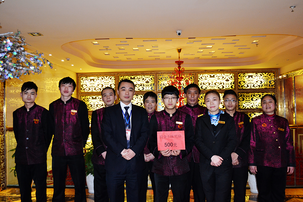 金沙店传菜员蒲俊刚,2014年3月2日,他像往常一样值班收拾酒瓶,中途在收拾四楼包间蜀王玉都酒瓶时,在餐桌下拾得现金壹万元整,他此时毫不犹豫的在第一时间交到收银台,通知管理人员与营业部人员联系客人。由于当时包间内还有客人在,不能确定失主身份,又通知主人联系失主,当天晚上主人到店之后,感激不已,立即拿出现金进行感谢,管理人员即刻拒绝,并给客人说这是我们应该做的。