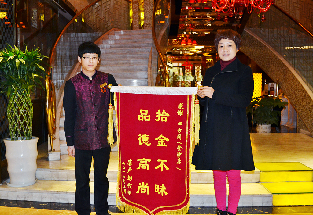 2014年03月05日中午,失主彭代刚先生的爱人罗姐特送来感谢锦旗一面,为感谢蒲俊刚拾金不昧,以及对四方阁管理团队的肯定。
